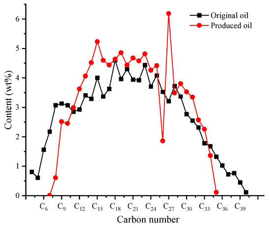 Comparison between hydrocarbon distributions of original oil and produced oil for heavy oil.