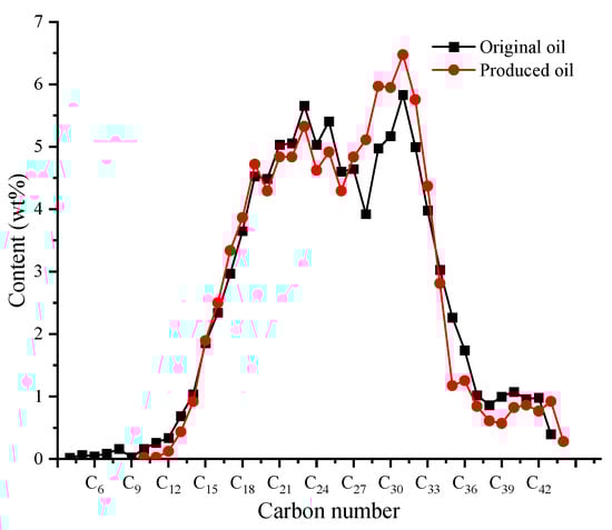 In order to explore the impacts of the oil properties on the CO2 extraction effect and the oil composition dynamic variation during huff-n-puff, two kinds of oil samples with different physical properties, as illustrated in Section 2.1, are prepared. Figure 2 illustrates the comparison between the hydrocarbon distributions of the original oil and produced oil for the light oil sample. Figure 3 illustrates the comparison between the hydrocarbon distributions of the original oil and produced oil for the heavy oil sample. For the light oil sample, it is discovered that the content of the intermediate components of C11 to C20 is increased significantly in the produced oil in comparison with the original oil. However, considering the fact that the produced gas-phase mixtures are released directly into the atmosphere and the light hydrocarbons contained in the gas-phase mixtures are not well collected, the content of the light components of C4 to C10 in the produced oil is lower compared with that in the original oil. The light to intermediate components in the oil are the main extracting objectives of CO2, which leads to the hydrocarbon distribution of the produced oil becoming lighter in comparison with the original oil. This is responsible for the content of the intermediate components being increased while that of the heavy components is reduced in the produced oil. At the same time, it can be discovered that for heavy oil, the variation among the hydrocarbon distributions of the produced oil and original oil is not as obvious as that of the light oil sample. The oil composition does not vary a lot after interacting with the CO2. For the heavy oil samples, the content of heavy components is high while that of light components is low. Meanwhile, the extraction objectives of CO2 are mainly for the light to intermediate components. Therefore, the composition variation for the heavy oil sample is not as significant as the light oil sample. Some measures such as lifting the pressure and extending the time can be adopted to improve the extraction by CO2. During CO2 huff-n-puff implementation in tight formations, the extraction effect of CO2 is non-negligible. On the one hand, the hydrocarbon distribution of the produced oil becomes lighter compared to the reservoir original oil, which is conducive to improving the oil properties and decreasing the oil density and viscosity. One the other hand, the residual oil after huff-n-puff becomes heavier at the same time that the oil density and viscosity are increased, which causes difficulty in the development of the reservoir residual oil. Meanwhile, asphaltene deposition may be induced due to the oil composition variation, which will block the small pores and throats in the reservoir, hence reducing the reservoir permeability, ultimately causing a decrease in oil production.