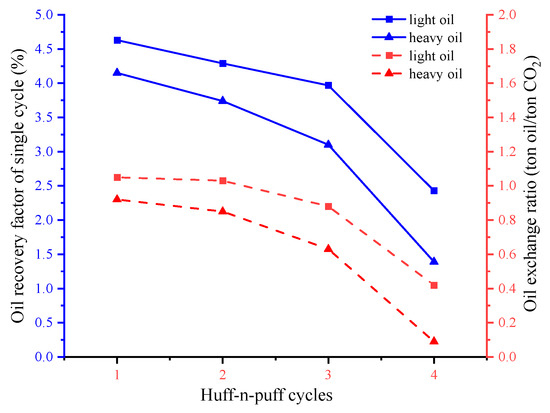 CO2 extraction efficiency is impacted by the original oil composition. To explore the impacts of oil properties and oil composition on the CO2 extraction efficiency, the heavy oil sample as well as the light oil sample are used to conduct multiple cycles of huff-n-puff experiments. The results are shown in Figure 4. It is presented that for both the heavy oil sample and the light oil sample, if the huff-n-puff cycles are increased, the oil exchange ratio and oil recovery are decreased. The declining speed of the oil exchange ratio and the single-cycle oil recovery accelerate when the CO2 huff-n-puff cycles surpass three. After three cycles, the oil increment of the CO2 huff-n-puff is low. The production is characterized as low oil productivity with high gas productivity. Large amounts of CO2 gas are produced with small amounts of oil involved. It is suggested the number of cycles should be limited to no more than three when implementing CO2 huff-n-puff. After implementation, long periods of soaking are also advised to redistribute the water, oil and gas under capillary force. Under the same conditions, both the oil exchange ratio and the oil recovery factor of the heavy oil are lower than those of the light oil. The fact that the content of the heavy components as well as the oil density and viscosity are higher for the heavy oil is responsible for this. In the CO2 huff-n-puff process, the miscibility of the CO2 with the heavy oil is poor, which leads to a lower efficiency of the CO2 extracting for heavy oil compared to light oil under the same conditions. Meanwhile, after three cycles of implementation, the declining speed of the oil exchange ratio and the oil recovery is much faster for the heavy oil sample. Therefore, the effect of huff-n-puff cycles on the oil exchange ratio and the oil recovery should be given more attention when implementing huff-n-puff in heavy oil reservoirs. It is advised that the huff-n-puff cycles should be optimized for achieving higher economic efficiency. The oil composition has significant influences on the CO2 extraction efficiency of oil. Light oil is preferred for the implementation of CO2 huff-n-puff. Further studies should be conducted to quantitatively identify the effect of oil composition and oil viscosity on the oil exchange ratio as well as the oil recovery factor during implementation. Oil composition standards for the implementation of CO2 huff-n-puff in tight oil should be established.