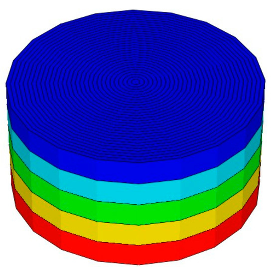 For this study, the GEM compositional simulator is used to simulate CO2 huff-n-puff in tight oil. A multi-dimensional geological model of the target reservoir is established to provide the medium for the CO2 and oil interaction. The equation of state is employed to calculate oil composition and property variation during the process. The oil composition dynamic variation as well as its influencing factors are investigated in detail. The compositional model of huff-n-puff is established on the basis of the actual geological parameters of the tight formations in the Songliao Basin, China. Considering the fact that huff-n-puff is always implemented in a single well, the three-dimensional cylindrical geological model is used and two wells are drilled at the same position in the center of the model (see Figure 5). These two wells are set as the injection well and the production well, respectively. Furthermore, these two wells are opened alternately to imitate the operation of the huff-n-puff. The corresponding parameters used in the model are listed in Table 1. The reservoir fluid PVT model used in the numerical simulation is built on account of the Peng–Robinson equation of state [44]. The reservoir oil is divided into five pseudo-components including the volatile components (CO2), the light components (C4–C6), the intermediate components (C7–C15), the transitive components (C16–C30) and the heavy components (C31–C40). The pseudo-components of the oil are acquired by matching the density, the viscosity, the gas–oil ratio and the saturation pressure of the actual reservoir oil. The comparison between the actual values and the fitting values is presented in Table 2. It can be discovered that the relative error for all the parameters is less than 5%. Therefore the reservoir fluid model can reflect the actual reservoir oil properties and is accurate enough to be used in the numerical simulation model.