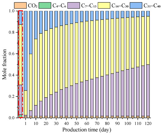 After being injected underground, considering the special conditions underground, CO2 will reach a supercritical state. Supercritical CO2 has a strong ability to be extracted and will interact with the reservoir oil. The light components in the oil will be extracted, which leads to the oil composition variation. The differences between the composition of the produced oil and original oil are significant. Figure 6 illustrates the produced oil composition variation along with the production time during the CO2 huff-n-puff. In comparison with the original oil composition (see the red box in Figure 6), the composition of the produced oil undergoes significant differences and varies with production time. At the very beginning of production, the proportion of heavy components in the produced oil is noticeably higher than that in the original oil. The oil near the well bore is first produced at the very beginning of the production. Since the supercritical CO2 continuously extracts the light components of the oil near the well bore when the CO2 is injected, the proportion of the heavy components in the oil near the well bore increases, while that of the light components decreases. In the early stages of production, the oil near the well bore is preferentially displaced under the elastic effect and the gas driving effect. Therefore the content of heavy components in the oil produced at the very beginning is much higher than in the original oil. Meanwhile, the density and the viscosity of the oil produced at the very beginning are much higher than those of the original oil (see Figure 7). The properties of the produced oil are worsened, which is unfavorable for oil production as well as oil transportation. It is suggested that oil viscosity reducers need to be added to the well during the early stages of oil production for improving the produced oil properties as well as for reducing the flow resistance of the crude oil in the well bore and the surface gathering pipelines. During the production period, the oil near the well bore is gradually completely produced, which causes a decrease in the proportion of heavy components in the produced oil. Furthermore, as the reservoir pressure decreases, the effect of the elastic energy and the gas driving becomes weaker. The effect of the CO2 extraction plays a more and more significant role in the oil production. Correspondingly, as for the produced oil, the proportion of the light and intermediate components is increased continuously, while that of the heavy components is decreased gradually. Meanwhile, the viscosity and the density of the produced oil are gradually reduced. At the later stages of oil production, the extraction effect of the CO2 plays a dominant role in oil production. The light and intermediate components of the oil are continuously extracted by the CO2 and are produced simultaneously, which causes the proportion of the light to intermediate components to be high in the produced oil while the content of the heavy components is low. Meanwhile, the density and viscosity of the produced oil are much lower than those of the original oil. The oil properties are significantly improved, which is advantageous for oil production and transportation.