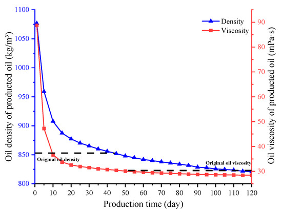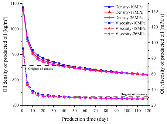 Figure 8 illustrates the produced oil composition variation under different reservoir pressure at the very beginning of production. In comparison with the original oil, the content of heavy components is significantly increased in the produced oil, while that of light components, intermediate components and transitive components is decreased. In addition, it is demonstrated that the content of the intermediate and the transitive components in the produced oil is lifted with the increasing of the reservoir pressure, while the content of the heavy components is decreased with the increasing of the reservoir pressure. The miscibility of CO2 with crude oil is increased with reservoir pressure. Miscibility flooding may occur during CO2 injection under high-pressure conditions, which causes the proportion of heavy components in the oil near the well bore to decrease while the content of the intermediate and transitive components increases. This is consistent with the research results of Li et al. (2021) [45] and Cao et al. (2013) [46]. During production, the oil close to the well bore is driven out first under the effect of the elastic energy and the gas driving. Therefore, the proportion of the heavy components in the produced oil is decreased with the increasing of the reservoir pressure, while the content of the intermediate and the transitive components is increased with the increasing of the reservoir pressure. Meanwhile, the viscosity and the density of the produced oil are significantly higher than those of the original oil at the very beginning of the oil production. Furthermore, as the reservoir pressure increases, the viscosity and density of the produced oil decrease (Figure 9). At the later stages of production, the effect of the elastic energy and the gas driving is weakened gradually. The CO2 extraction effect is of great importance to oil production. More intermediate and light components are extracted and produced, which causes the density and the viscosity of the produced oil to be much lower than that of the original oil. The oil properties are notably improved. Moreover, due to the fact the reservoir pressure tends to be consistent in different models in the later stages of oil production, the extraction effect of CO2 is similar. Therefore, the viscosity and density of the produced oil tend to be equal.