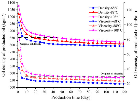 Figure 10 illustrates the produced oil composition variation under different reservoir temperatures at the early stages of oil production. Significant differences can be seen between the composition of the produced oil and the original oil. Generally, the content of the light components (C4–C6) and intermediate components (C7–C15) is decreased, while that of the transitive components (C16–C30) and heavy components (C31–C40) is increased in the produced oil. Meanwhile, the proportion of heavy components in the produced oil is decreased with the decreasing of the reservoir temperature, while the relationship between the temperature and the content of the intermediate and the transitive components is discovered to present an opposite tendency. In low temperature conditions, the miscibility effect between the CO2 and the crude oil is strengthened. Miscibility flooding may occur near the well bore during the CO2 injection process, which may reduce the proportion of heavy components in the oil near the well bore. This is consistent with the research results of Li et al. (2021) [45] and Zanganeh et al. (2012) [47]. During production, the oil near the well bore is produced first. Therefore, at the very beginning of the production, the proportion of heavy components in the produced oil decreases with the decreasing of the reservoir temperature. In addition, the viscosity and density of the produced oil in the early stages of production are significantly higher than those of the original oil (see Figure 11). Moreover, the viscosity and density of the produced oil increase with the reservoir temperature. At the later stages of production, the extraction of CO2 gradually occupies a dominant position in the oil production. The light and intermediate components are extracted and produced, with the viscosity and the density of the produced oil much lower than those of the original oil. The oil properties of the produced oil are remarkably improved, which is beneficial for oil production and transportation. Compared with the impacts of the reservoir pressure, the influences of reservoir temperature on the viscosity and density of the produced oil are much more significant. There are still significant differences in the viscosity and density of the produced oil at different temperatures in the later stages of production.