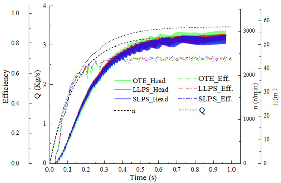 - Zhang, Y.L.; Zhu, Z.C.; Dou, H.S.; Cui, B.L.; Li, Y.; Zhou, Z.Z. Numerical Investigation of Transient Flow in a Prototype Centrifugal Pump during Startup Period. Int. J. Turbo Jet-Engines 2017, 34, 167–176. [Google Scholar] [CrossRef]