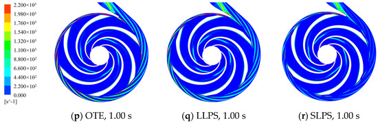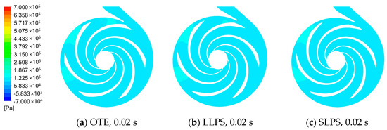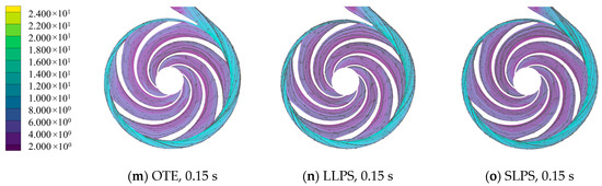 - Through the analysis of static pressure distribution and velocity streamline, it was found that the small low-pressure area at the outlet of OTE pump blade is prone to flow disorder. The low-pressure area of the LLPS and SLPS pumps at the same location is significantly reduced, and the impeller outlet pressure distribution is more uniform. There is a large eddy current in the three flow channels in the impeller, which leads to flow blockage and makes the centrifugal pump lose pumping effect. Through vortex analysis, it was found that the vortex at the outlet of the centrifugal pump blade after trailing edge filing is significantly reduced, which effectively promotes the stability of the centrifugal pump and inhibits the pressure fluctuation.