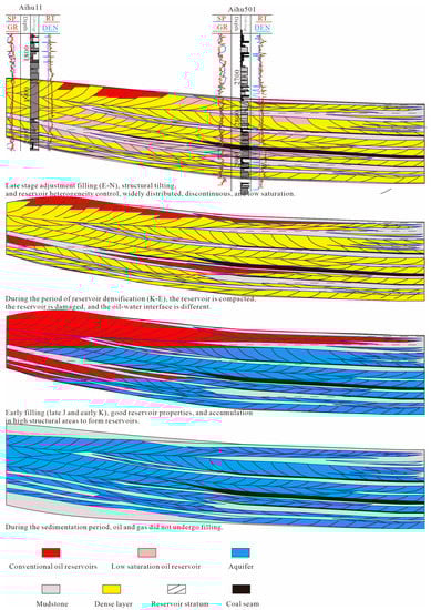- Gao, C.L.; Wang, J.; Jin, J.; Liu, M.; Ren, Y.; Liu, K.; Wang, K.; Deng, Y. Heterogeneity and differential hydrocarbon accumulation model of deep reservoirs in foreland thrust belts: A case study of deep Cretaceous Qingshuihe Formation clastic reservoirs in southern Junggar Basin, NW China. Pet. Explor. Dev. 2023, 50, 360–372. [Google Scholar] [CrossRef]