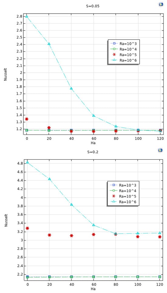 The effect of Ha out of Nu for different S and Ra values is shown in Figure 5. As the diffusion of the rate of heat transfer predominates at reduced values of Ra (), and for a given S value, Nu is virtually constant and is barely influenced by Ha. The magnetic force rises in strength at , preventing buoyant forces induced by the rate of heat transfer, although Nu decreases constantly with Ha up to about Ra = 60. Considering the exception that with slightly larger Ha values Nu almost becomes constant, between Ha = 100 and 120, whereas Nu is significantly greater at , this exhibits comparable tendencies for value of . The thermal characteristics of the space between heated cylinders are significantly influenced by the regime of Ra and Ha.