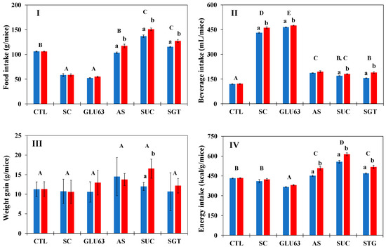 Effect of the thermal treatment (121 ± 2 °C, 15 min) of commercial sweeteners on the food intake (I), drink intake (II), weight gain (III), and energy intake (IV) in C57BL/6 mice during 24 weeks of experimentation. Blue bars indicate samples without thermal treatment. Red bars indicate samples subjected to heat. Different lowercase letters (a and b) show significant differences caused by the thermal treatment (p < 0.05). Different capital letters (A, B, C, D, and E) represent significant differences between sweeteners (p < 0.05).