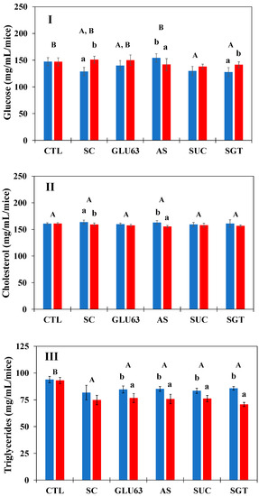 Effect of the thermal treatment (121 ± 2 °C, 15 min) of commercial sweeteners on blood glucose (I), cholesterol (II), and triglycerides (III) of C57BL/6 mice during 24 weeks of experimentation. Blue bars indicate samples without thermal treatment. Red bars indicate samples subjected to heat. Different lowercase letters (a and b) show significant differences caused by the thermal treatment (p < 0.05). Different capital letters (A and B) represent significant differences between sweeteners (p < 0.05).