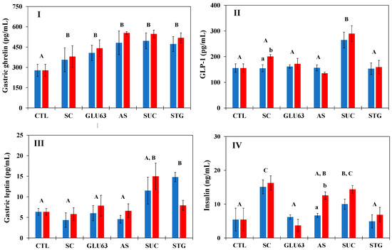 Effect of the thermal treatment (121 ± 2 °C, 15 min) of commercial sweeteners on gastric ghrelin (I), GLP-1 (II), gastric leptin (III), and insulin (IV) of C57BL/6 mice during 24 weeks of experimentation. Blue bars indicate samples without thermal treatment. Red bars indicate samples subjected to heat. Different lowercase letters (a and b) show significant differences caused by the thermal treatment (p < 0.05). Different capital letters (A, B, and C) represent significant differences between sweeteners (p < 0.05).