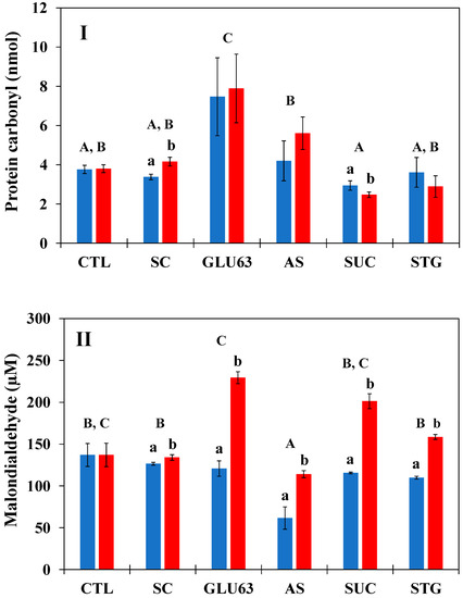 Moreover, thermal treatment increased (p < 0.05) by 23% and decreased by 16% the carbonyl content for the SC and SUC groups, respectively (Figure 4(I)). As for the TBARS levels (Figure 4(II)), thermal treatment increased this variable (p < 0.05) in the SC (6%), GLU63 (90%), AS (85%), SUC (74%), and SGT (44%) groups (Figure 4(II)).