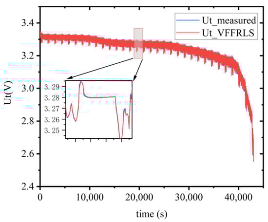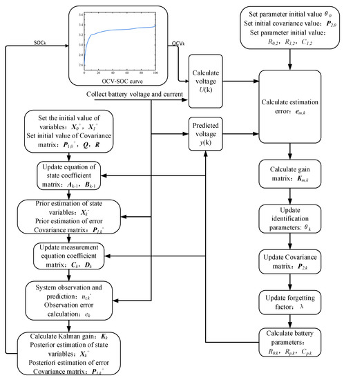 In this paper, a joint estimation algorithm of EKF and VFF-RLS is used to estimate the battery state. Firstly, the parameters in the ECM are identified online through the VFF-RLS algorithm using the voltage and current information obtained from real-time measurement and the SOC information obtained from the last estimation, and then the coefficient matrices in the Equation of state are updated using the identified parameters to improve the accuracy of SOC estimation. The structural diagram of the joint estimation algorithm is shown in Figure 3.