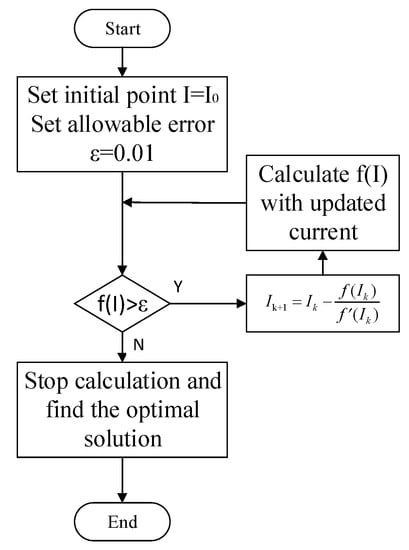 According to the expression of the battery terminal voltage Ut, k+L obtained from Formula (28) after L cycles, assuming that the voltage is discharged to the lower voltage limit or charged to the upper voltage limit after L cycles, the maximum current that the battery can release within the predicted time can be calculated. In this paper, the Newton iterative method is used to optimize the maximum current under voltage constraints, set the optimization objective function as shown in Formula (29), and the algorithm flow chart is shown in Figure 4.