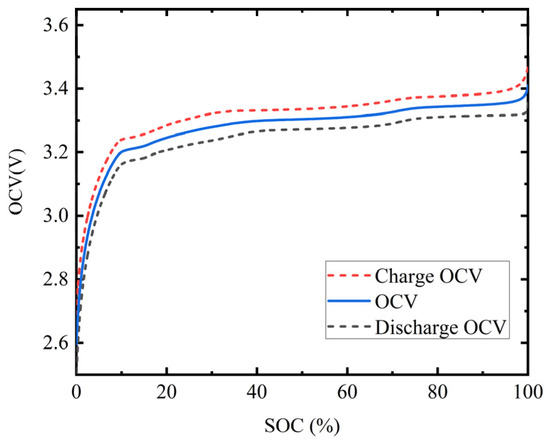 In this paper, the low current charging and discharging method is used to obtain the OCV-SOC curve of the battery. During the charging and discharging process of the battery, a current of 0.05 C is used. Due to the small ohmic potential and polarization potential under low current charging and discharging conditions, they can be ignored. Therefore, it can be considered that the terminal voltage at this point is an open circuit voltage. After data processing, the two curves during charging and discharging are averaged to obtain the OCV-SOC curve of the battery. The experimental results are shown in Figure 7.
