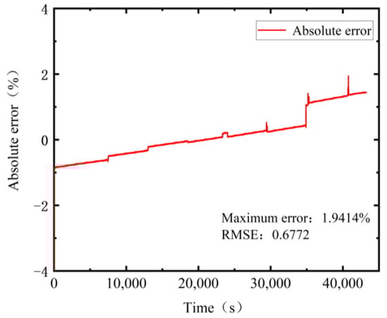In Figure 11, it can be concluded that the estimated value of battery SOC obtained through the EKF algorithm is very close to the actual value, indicating that the EKF wave algorithm can quickly converge when estimating the state of charge of batteries. In Figure 12, the maximum error after convergence is 1.94%, and the root-mean-square deviation is 0.677, indicating that EKF algorithm has good battery state of charge estimation accuracy.