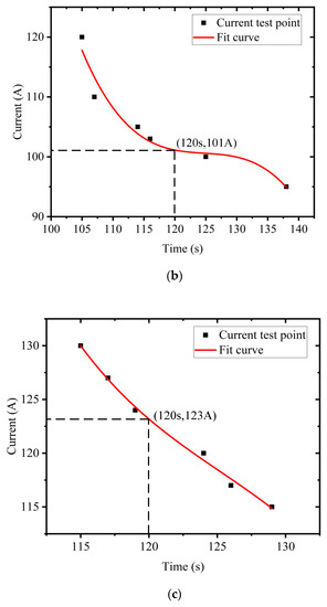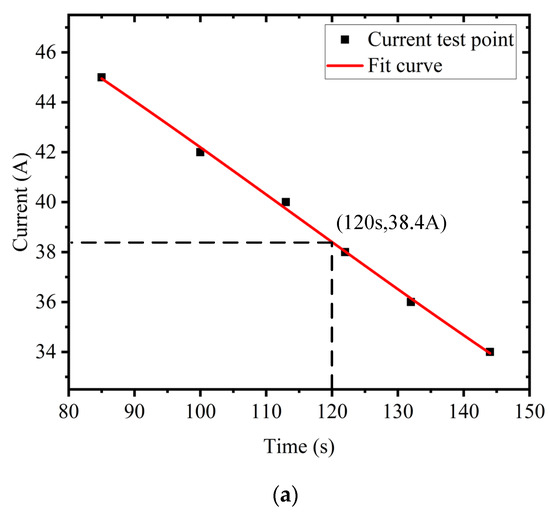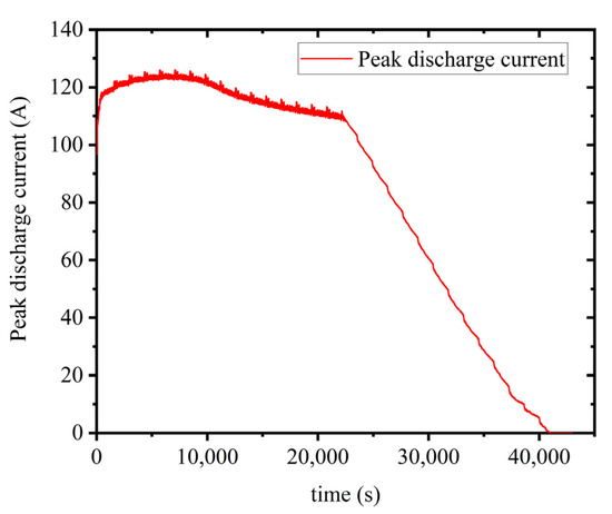 By fitting the above data, the maximum discharge current reference values of each SOC point battery can be obtained, as shown in Figure 13. When the battery SOC is 70%, the maximum discharge current reference value corresponding to a discharge time of 120 s is 123 A. When the battery SOC is 50%, the maximum discharge current reference value corresponding to a discharge time of 120 s is 101.6 A. When the SOC of the battery is 20% and the discharge time is 120 s, the corresponding maximum discharge current reference value is 38.4 A.