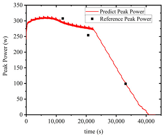 To obtain the reference value of power, an experiment is conducted. The fully charged battery is first discharged to the set SOC point using a constant current of 1/2 C. After standing for 2 h, the battery is discharged using a constant current and the time t taken to discharge to the battery’s cut-off voltage is recorded. Adjust the discharge current according to the magnitude of time t. Repeat the peak current test at least 5 times to ensure that there are two times that are greater than the predicted time and two times that are less than the predicted time. Perform more than 5 discharge tests on the battery at one SOC point, and obtain the fitting curve of the battery discharge current and time through software fitting. By fitting the curve, the peak discharge current reference value of the battery during the predicted time can be obtained. The reference value of the battery peak power is obtained by multiplying the peak discharge current by the battery terminal voltage at the end of discharge. The experimental results of reference values at 70%, 50%, and 20% SOC are shown in Table 3.