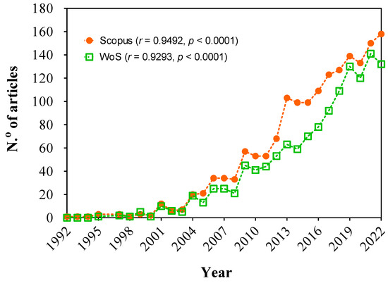 Figure 1 illustrates the increase in the number of articles over time (Pearson’s r = 0.95 and 0.93, for WoS and Scopus databases, respectively, with p < 0.001); a more pronounced growth in publications is attained since 2013 and, notably, in the years 2020 and 2022.