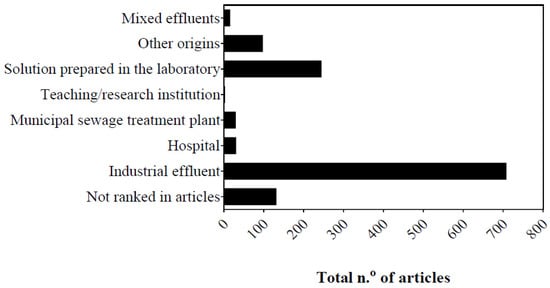 Figure 2 presents the sources of the pollutants listed in Table 1. However, 132 studies did not specify the origin of the treated matrix. Among those that were identified, 16 studies used the Fenton method to simultaneously degrade products from different sources, such as industrial effluent/laboratory-prepared solution (9), hospital effluent/laboratory-prepared solution (2), industrial effluent/other sources (1), industrial effluent/municipal wastewater treatment plant (WWTP) (1), and municipal WWTP/laboratory-prepared solution (2).