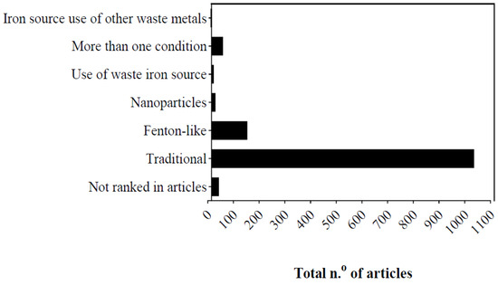 Most studies (80.9%) used traditional reaction conditions (1022), followed by Fenton-like reactions (140) (Figure 3).