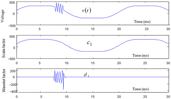 Figure 3 shows sampled voltage signal, scaling factor (), and wavelet factor (), respectively. Let us suppose the signal is calculated as shown below: