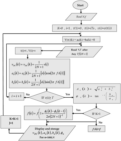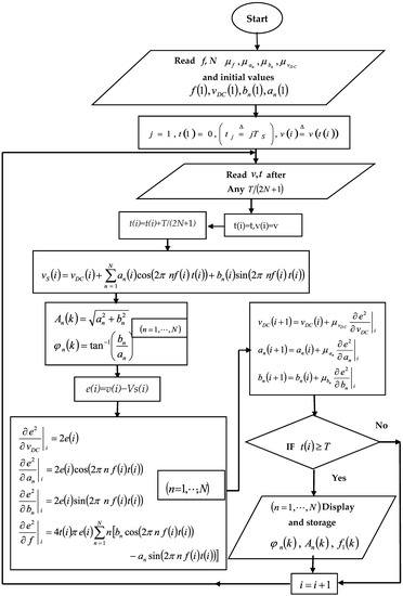 In the above relationships, is the period number, is the sample number in the kth period, n is the harmonics number, and N is the total number of harmonics. The number of samples in each period starts from one, and the initial values of the variables are one at the beginning of each period; this means that .