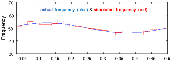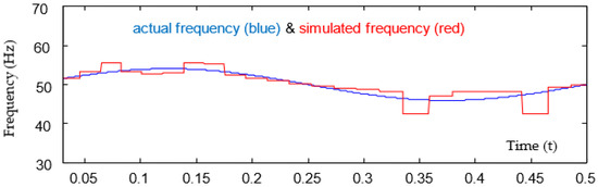 Figure 5 show the frequency of the first harmonic, the blue waveform is the actual frequency of the first harmonic, and the waveform of the frequency calculated by the algebraic method.