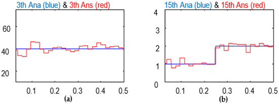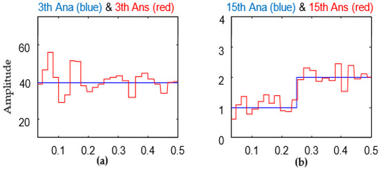 (a) 3rd harmonic amplitude; (b) 15th harmonic amplitude (blue curves are actual, and red curves are simulated) (algebraic method).