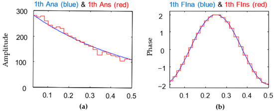 (a) First harmonic amplitude; (b) first harmonic phase in rad/(blue curves are actual, and red curves are simulated).