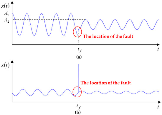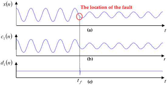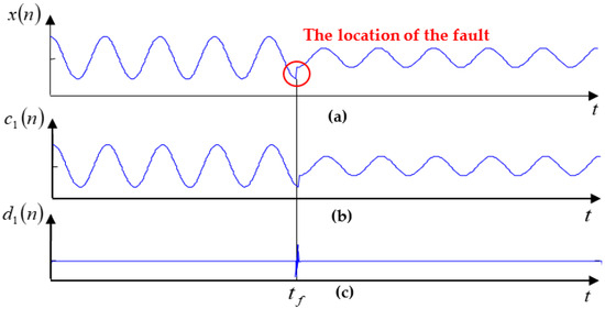 The fault occurred when the size of the derivative of the signal is minimum at that moment. (a) Signal itself; (b) scaling factor; (c) wavelet factor.