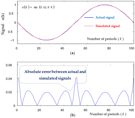 Figure 27. (a) Actual and simulated signals. (b) Absolute error between actual and simulated signals.