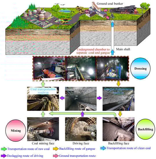 Deep mining has become the norm in coal resource development in China since the increasing depletion of shallow resources [1,2]. At present, coal preparation is directly completed underground in many deep mines to solve problems, such as increased gangue production, reduced efficiency of mine hoisting, gangue discharge, and surface subsidence [3,4]. The separated gangue is directly backfilled in the goaf, whereby, underground mining, dressing, and backfilling have been integrated (Figure 1) [5,6,7,8]. The deep chamber for coal–gangue separation (DCCS) is an important place for underground coal preparation. Therefore, the long-term stability in controlling the rocks surrounding DCCS can ensure the efficient operation of the integrated system of mining, dressing, and backfilling [9].