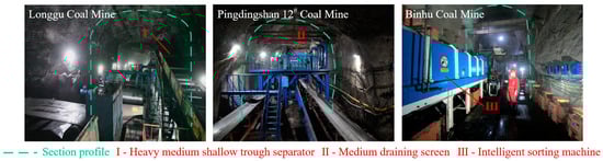Chambers in Chinese coal mines are defined as underground roadways with specific functional uses, including substations, pump rooms, and winch rooms. The development of underground mechanical equipment has led to new requirements for the spatial structures of chambers, which must now be designed to accommodate large-scale, intensive, and intelligent machinery [16]. Figure 2 shows the underground chamber for coal–gangue separation at Longgu Coal Mine, Pingdingshan 12# Coal Mine, and Binhu Coal Mine [6,8]. Table 1 shows the spatial size statistics for chambers of coal–gangue separations. DCCS is characterized by its large section size, elongated cross-sectional shape, and significant difference between the axial length and section size due to the centralized placement of coal dressing, disintermediation, media recycling, and other equipment.