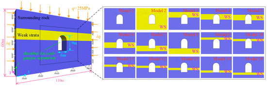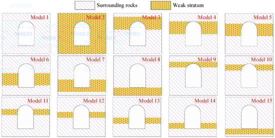 When the surface surrounding rocks of DCCS contain a single weak stratum, there are various situations on its horizon (Figure 3). A research method that combines similar simulation tests and numerical simulations is used to study the influence of the weak-stratum horizon on the surrounding-rock stability of DCCS. Models 1 and 2 are mainly used as comparative references. Models 3 to 8 are used to analyze the weak stratum with large thicknesses, while models 9 to 15 are used to study the weak stratum with small thicknesses.