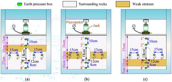 Burial depth is designed to be 1000 m at the top of the model due to the research background for deep mining. The load applied to the top of the models is gradually increased from 0 to 0.35 MPa, at an increment of 0.07 MPa, after the chamber is excavated. Eight earth pressure boxes are arranged in each physical model to monitor the evolution law of the stress field in the surrounding rocks. Figure 4 presents the specific location of each earth pressure box. Monitoring data are stored in real-time by a static strain gauge. The deformation and failure of the surrounding rocks are monitored and recorded by drawing grids on the surfaces of the physical models.