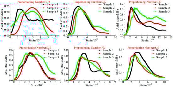 Figure 6 shows the stress–strain curves of specimens with different proportioning schemes under uniaxial compression. Sample 1, with a proportioning number of 737, experiences fragmentation when the strain exceeds 6 × 10−3, which prevents the acquisition of subsequent stress–strain data. The test aims to obtain the uniaxial compressive strength of each proportioning material. Sample 1 is at the post-peak stage when fragmentation occurs. Therefore, it does not have any impact on the test results.