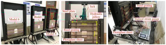 Figure 7 shows the physical models laid according to the proportioning schemes for similar materials in the rock stratum. Plexiglass sheets with a thickness of 100 mm are installed at the front and rear sides and reinforced with a steel grating after the model is naturally dried. The frame beams and plexiglass sheets fix the displacement around the model and at the bottom. Hydraulic jacks are used to apply vertical loads to the top of the models to simulate the overlying-stratum stress. The load is determined by converting the pressure gauge reading in the hydraulic pillow.