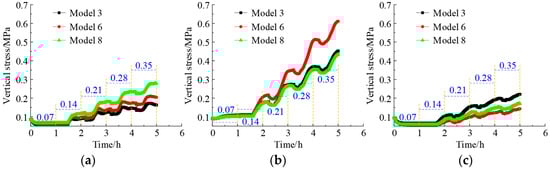 Monitoring results of vertical stress in the surrounding rocks of the chamber at different loading stages: (a) the 1# earth pressure box; (b) 3# earth pressure box; (c) 8# earth pressure box.