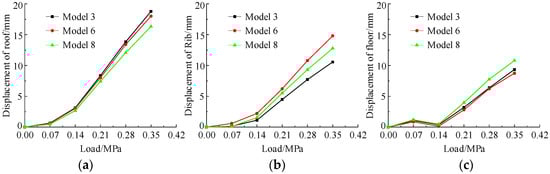 The measuring points were separately arranged in the roof, side, and floor of the chamber to monitor the evolution of the displacement field in the surrounding rocks during the loading process. Figure 9 shows the results. (1) The maximum displacement of the surrounding rocks was in the weak stratum. (2) The growth rate of the surrounding rock displacement significantly increased when the load increased from 0.14 MPa. (3) The descending order is characterized in the following aspects, i.e., the roof displacements in models 3, 6, and 8 were under the same loading, the surrounding rock displacements in the side of models 6, 8, and 3, and the floor displacements in models 8, 3, and 6.