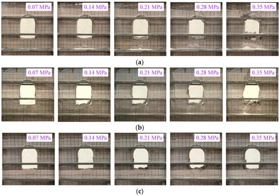 Figure 10 shows the deformation and failure in the surrounding rocks of the chamber at each loading stage. (1) The weak stratum first fails within each physical model during the loading. (2) When the weak stratum is located in the roof, axial tensile cracks first occur in the middle of the roof with increased loads. Then, the roof experiences penetrating failure and bending deflection. As a result, the rock masses at the shoulder arch undergo tensile-fracture failure. The broken blocks engage with each other by friction and gradually slide off. Surrounding rocks on two sides finally experience wedge failure due to the weakened constraint effect. (3) When a weak stratum is located on two sides, the weak rocks in the free surface first undergo buckling failure under the extrusion of the roof and floor. The buckling failure by the weak rocks gradually increases as the load increases, and the damage range inside the weak rocks gradually expanded. Ultimately, the weak rocks exhibit a concave failure pattern. (4) The floor first generates tensile cracks during loading, when a weak stratum is located in the floor. Next, the floor eventually swells and damages through the development of tensile cracks. As a result, constraints to the surrounding rocks on the side near the floor become weakened, and the surrounding rocks on the two sides undergo wedge failure. (5) The deformation and failure of the surrounding rocks in the chamber in models 3, 6, and 8 are in descending order under the same loading.