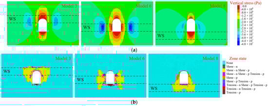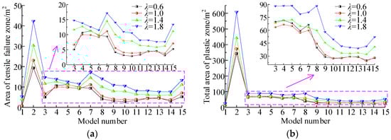 Figure 14 shows the variation curves for the PFA in the surrounding rocks under different lateral pressure coefficients. (1) The tensile failure area (TFA) and the PFA are always positively correlated with the thickness of the weak stratum. (2) When the thickness of the weak stratum is 5 m, the TFA and PFA in the surrounding rocks in model 8 are at their minimum when 0.6 ≤ λ ≤ 1.4. The floor of DCCS arranged along the weak stratum is beneficial in reducing the plastic failure range of the surrounding rocks. (3) When the thickness of the weak stratum is 5 m, the TFA and PFA in the surrounding rocks in model 6 are at their minimum if λ is 1.8. The two sides of DCCS are arranged along the weak stratum and are most conducive to reducing the plastic failure range in the surrounding rocks. (4) When the thickness of the weak stratum is 2 m, the TFA and PFA in the surrounding rocks in model 14 are at their minimum when 0.6 ≤ λ ≤ 1.4. Arranging the side near the floor of DCCS along the weak stratum is most conducive to reducing the plastic failure range in the surrounding rocks when the thickness of the weak stratum is small. (5) If the thickness of the weak stratum is 2 m and λ is 1.8, the plastic failure range of the surrounding rocks is the minimum when the weak stratum is located in the middle of the side.