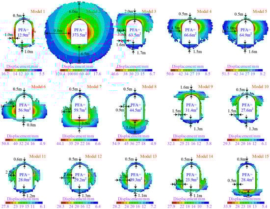 Figure 13 shows the plastic failure range and displacement distribution characteristics in the surrounding rocks of DCCS in each scheme when λ is 1.0. PFA is the plastic failure area in the surrounding rocks within the section calculated by the self-programmed FISH program. (1) The plastic failure range and maximum displacement of the surrounding rocks are positively correlated with the thickness of the weak stratum. The maximum displacement of the surrounding rocks occurs in the weak rocks on the free surface. (2) The constraint effect on the adjacent surrounding rocks is weakened after the failure of the weak stratum. It results in a wedge-shaped failure in the adjacent surrounding rocks, which is consistent with the results of similar simulation tests. (3) The plastic failure range of the surrounding rocks is the largest when the roof of DCCS is arranged along the weak stratum. The maximum displacement of the surrounding rocks reaches the peak when the floor of DCCS is arranged along the weak stratum. (4) There is no direct correspondence between the plastic failure range of the surrounding rocks and the maximum displacement. For example, the plastic failure range of the surrounding rocks in model 4 is larger than in model 5. However, the maximum displacement of the surrounding rocks in model 4 is smaller than in model 5. (5) The plastic failure range of the surrounding rocks in model 8 is at its minimum when the thickness of the weak stratum is 5 m. Moreover, the maximum displacement of the surrounding rocks in model 7 is the minimum value. (6) The plastic failure range and maximum displacement of the surrounding rocks in model 14 are both the minimum values when the thickness of the weak stratum is 2 m.