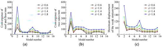 Figure 15 shows the variation in the curves of the surrounding rock convergence. (1) The location of the weak stratum is the maximum deformation area in the surrounding rocks and it is consistent with the results of similar simulation tests. (2) The convergence of the roof and floor is the maximum when the weak stratum is located on the floor. (3) The convergence of the two sides is proportional to λ. (4) When the thickness of the weak stratum is 5 m and λ is 0.6, the horizon of the weak stratum has little effect on the convergence of the roof and floor. (5) The displacement of the weak stratum in model 7 is the lowest when 0.6 ≤ λ ≤ 1 and the thickness of the weak stratum is 5 m. Furthermore, the displacement of the weak stratum in model 6 is the lowest when λ ≥ 1.4. (6) The displacement of the weak stratum in model 14 is the smallest when 0.6 ≤ λ ≤ 1 and the thickness of the weak stratum is 2 m. Furthermore, the displacement of the weak stratum in model 12 is the lowest when λ ≥ 1.4.