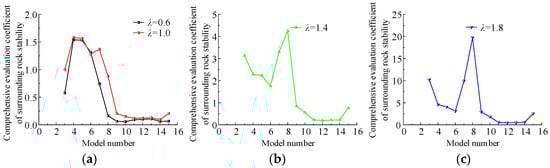 Variation curves for the comprehensive evaluation coefficients of the surrounding rock stability: (a) λ is 0.6 or 1.0; (b) λ is 1.4; (c) λ is 1.8.