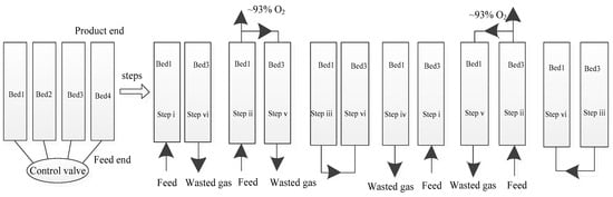 The cyclic sequence of the RCPSA oxygen production process is presented in Figure 1. Four beds (labeled bed1, bed2, bed3 and bed4) are employed to conduct rapid cycle and each bed goes though the same cycle steps sequentially [7]. Notably, bed1 and bed3 (bed2 and bed4) are connected for transferring gas and energy during pressure equalization and purge steps. The adsorption cycle consists of (i) co-current pressurization (PR) with compressed air, (ii) selective adsorption (AD) of N2 from compressed air to produce ~93% O2, (iii) pressure equalization down (PED), in which the product end is closed and the feed end is open and connected with another bed, (iv) countercurrent blow down (BD) and (v) purge (PU), in which the continuous purge step is employed for rinsing the desorption bed, (vi) pressure equalization up (PEU), in which the product end is closed and the feed end is open and connected with another bed, and the repetition of the cycle. The O2 enriched gases from the AD step are collected and the N2 enriched effluent gases from the BD are wasted. The step times of adsorption cycle are determined for maximizing the oxygen recovery. The optimal total cycle time is ~6 s and the individual step durations are 0.5, 2, 0.5, 0.5, 1.5 and 0.5 s, respectively, for steps i (tPR), ii (tAD), iii (tPED), iv (tBD), v (tPU) and vi (tPEU) of the cycle.