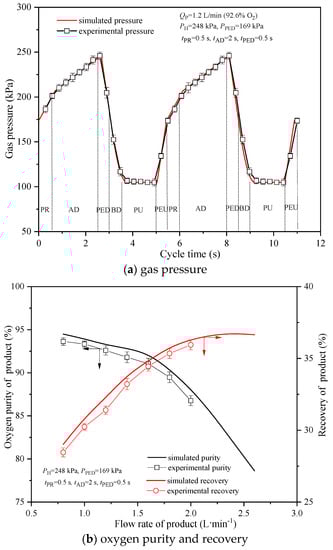 This section uses the experimental results obtained from our previous work [7] as verification of the simulation program. Figure 2 shows the comparison of experimental and simulated feed pressure change, oxygen purity and recovery (at steady-state operation after 35 cycles) of the RCPSA process with feed flowrate of 16 L·min−1 when the coefficient ki is estimated using case 3. The gas pressure in the experiment is consistent with the simulation results of five steps (PR, AD, PED, PU and PEU steps) except the BD step. However, the errors of gas pressure for the BD step are not caused by large changes of oxygen production performance due to same desorption pressure. The simulated oxygen purity and recovery are higher than the experiment results since the feed is simplified as an ideal gas mixture of N2 and O2 with ratio of 79:21 during the simulation process. However, the relative deviations of oxygen purity and recovery are, respectively, less than 1% and 1.5% with wide product flowrate range, which means the model gives a favorable prediction of the mass and heat transfer characteristics during the PSA process.