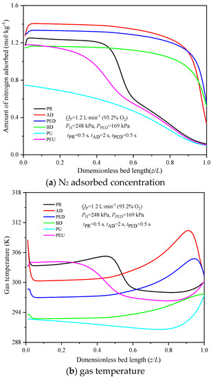 N2-adsorbed concentration and gas temperature distributions at the end of each step with dP = 0.45 mm, εb = 0.39 and QF = 16 L·min−1.