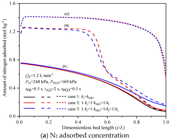 Three cases are employed for examining the influence of different mass transfer resistances since the dominant resistance of mass transfer is no longer macropore diffusion resistance for the small zeolite particles frequently employed in RCPSA process [12,13]. The resistance of macropore diffusion is solely considered the dominant resistance for case 1 and the combination of macropore diffusion and film resistance is assumed as the dominant resistance for case 2. However, case 3 regards the combination of film resistance, macropore diffusion resistance and axial dispersion effect as the dominant resistance for small LiLSX particles. Notably, a plug flow model replaces Equation (1) for case 3 since the effect of axial dispersion is added through an overall mass transfer coefficient in Equation (2) [13].