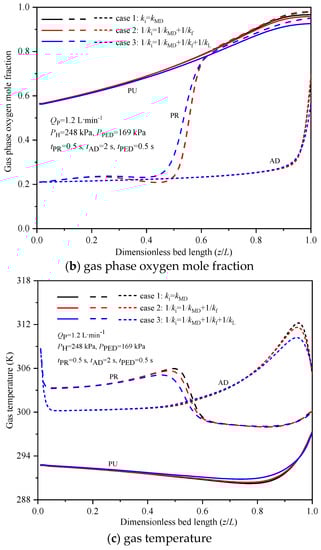 Figure 4a–c demonstrate the simulated axial distributions of nitrogen-adsorbed concentration, gas phase oxygen mole fraction and gas temperature at the end of the pressurization, adsorption and purge steps of the RCPSA process with different mass transfer models. After the pressurization and adsorption step, there is a noticeable difference in the nitrogen-adsorbed concentration, oxygen mole fraction and gas temperature profiles under variable mass transfer model conditions. The profiles of case 1 with solely consideration of macropore diffusion exhibit a greater amount of nitrogen-adsorbed concentration and sharper concentration front than case 2 and case 3. This is at least partially responsible for the improvement in oxygen purity, recovery and productivity with increasing mass transfer rate. Since the contributions from film resistance only represent ~9% of the total resistance for small particles [12,13], the concentration and temperature profiles are close for case 1 and case 2.