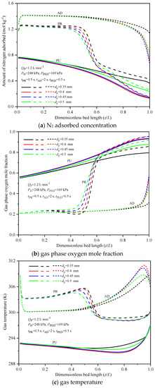 N2-adsorbed concentration, O2 mole fraction, temperature and performance with variable bed porosities with dp = 0.45 mm and QF = 16 L·min−1.